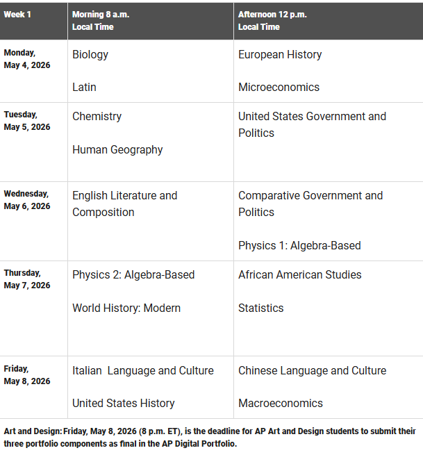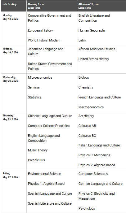 More information regarding AP Exams can be found here: May 2026 AP Exam Information.